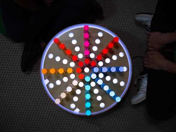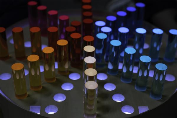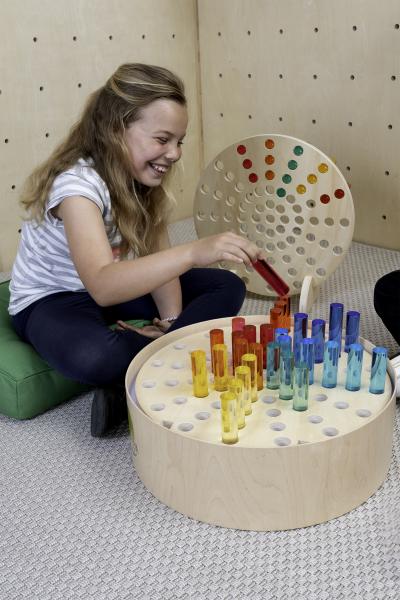 Für optische Experimente betrachten die Kinder die Welt durch die bunten Acrylzylinder oder platzieren sie für Farbaddition hintereinander.