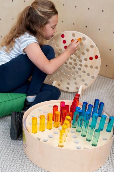 Wunderbar zum Spielen in der Bauecke und für den Lichttisch geeignet. Die 30 farbenfrohen dicken Acrylstäbe werden als Fenster und Lichtsteine eingesetzt und sind besonders hochwertig verarbeitet. Durch ihren Durchmesser von 2,5 cm sind sie richtig dick und liegen sehr gut in der Hand. Sie können zu Türmen gebaut oder in passende Lochwände eingesteckt werden. Die Zylinder erzeugen besonders schöne Lichtspiele - wenn die Sonne darauf trifft, leuchten sie in allen Regenbogen-Farben.