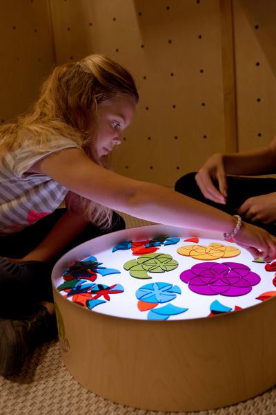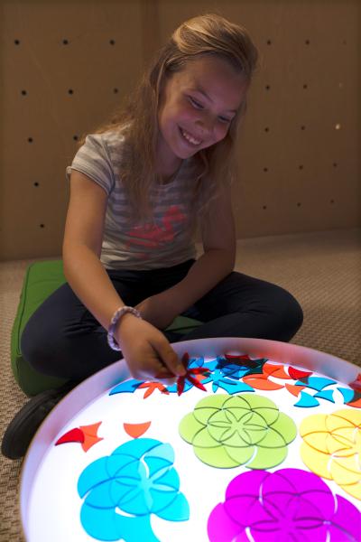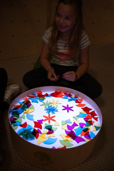 Das transparentem Acrylglas ermöglicht die beeindruckende Nutzung der Formen auf dem Lichttisch. Hier können die Kinder Mandalas legen, aus den Formen bunte Blumen bilden und frei Muster legen.