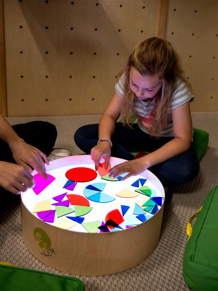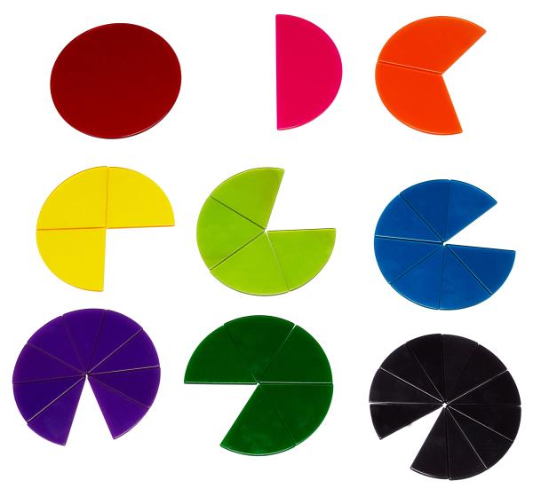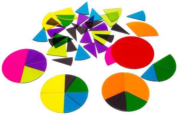 Die Anzahl der farbigen Bruchteile fügt sich immer zu einem ganzen Kreis. Dieses Set ermöglicht eine sehr sinnorientierte Herangehensweise.