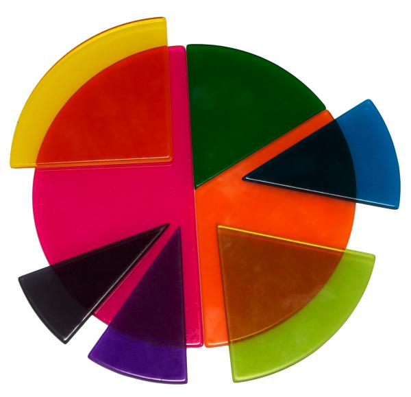 Bruchrechnen ganz anschaulich und transparent. Die 51 farbigen Kreis-Segmente sind perfekt für den Lichttisch oder Overhead-Projektor. Hier lernen die Kinder direkt beim Zuordnen, wieviele Viertel z..B ein Ganzes ergeben. Für jeden Bruch gibt es eine eigene Farbe.