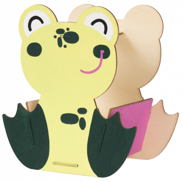 Ein tolles Bastelprojekt: Der Bausatz für diese Frosch-Körbchen aus Sperrholz besteht aus je 2 Fröschen für die Körbchenfront, 2 Seitenflächen, Boden und Griff. Die Bauteile werden zusammengesetzt und nach eigenem Geschmack bemalt.