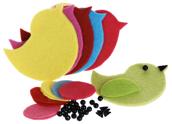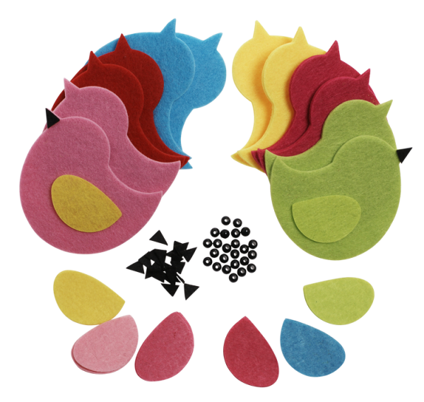 - 12 DIY-Filzrohlinge "Vögelchen" inkl. 24 schwarzer Kunststoffperlen und 24 Flügeln