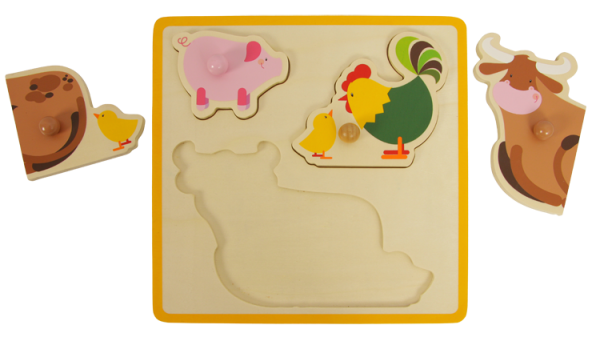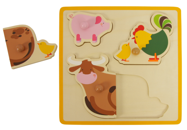 Wo passt das kleine Schweinchen rein? Hier oder da? Und der Hahn? ...und erst die Kuh – denn die besteht gleich aus zwei Teilen. Aber ganz gleich, wie lange du brauchst - mit dem runden Griff lassen sich die Figuren leicht in die dafür vorgesehenen Felder deines ersten kleinen Puzzles bugsieren.