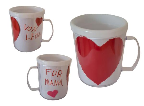 Ein schönes selbstgemaltes Bild, ein Foto oder einfach ein schöner Spruch –Hier können die Kinder ihrer Kreativität freien Lauf und einen ganz individuellen Becher gestalten.