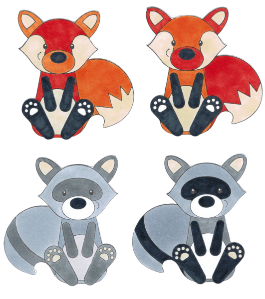 - 4 Holzstempel "Fuchs & Waschbär mit Fährte"