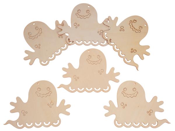 Schaurig schöne Windspiele. Die 6 Holz-Gespenster können mit bunten Fäden und Bändern beknüpft und gestaltet werden. Augen und Mund sind vorgestanzt und können optional herausgedrückt werden.