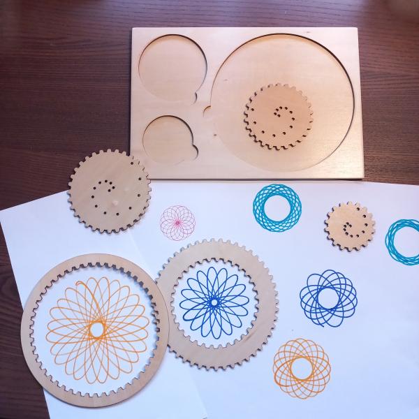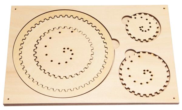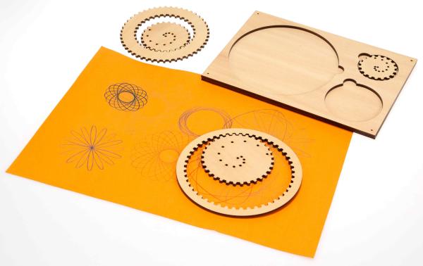 Im stabilen Holzrahmen sind 3 innere und 2 äußere Zahnräder. In der Mitte der Zahnräder sind Aussparungen für z.B. Fineliner oder fein gespitzte Bunstifte. Die Kinder stecken ihren Malstift in die Aussparung und kreisen mit dem Zahnrad im äußeren Zahnrahmen entlang. So ergeben sich immer neue Kreise, Spiralen und Mandalas.