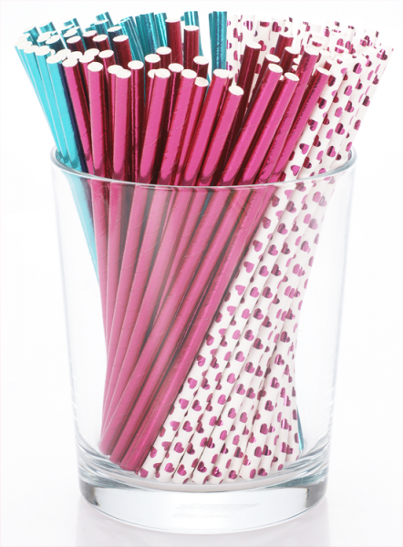 - 120 Papierstrohhalme, je 40 x in pink und türkis, und mit Herzmotiv