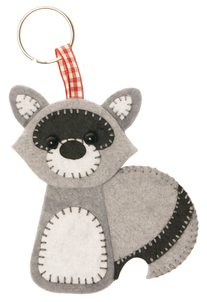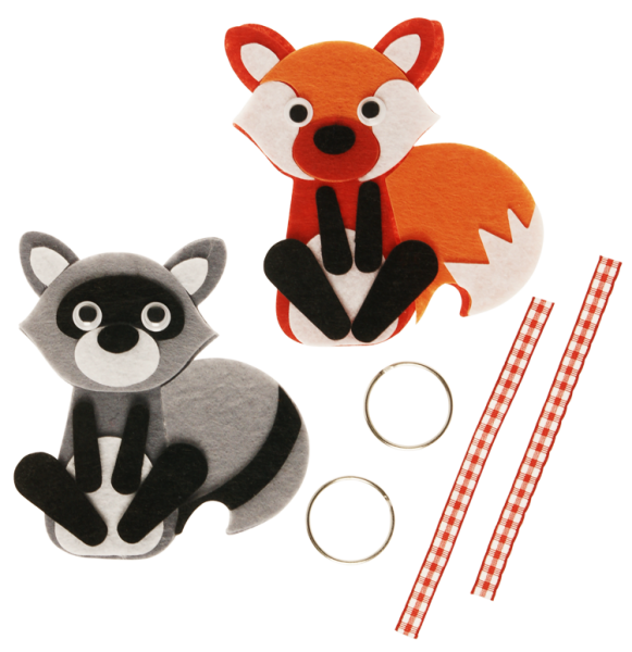 Mit diesen beiden lustigen Waldtieren kannst du deinen Schlüsselbund aufpeppen oder sie auf Taschen oder Karten kleben. Die Filzteile werden auf einander geklebt und so entsteht Stück für Stück ein süßer Fuchs und ein frecher Waschbär.