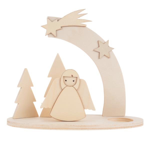 Bastelset für 1 Teelichthalter aus 8 Holzteilen. Bogen, 2 Sterne, Engel + Kleid, 2 Tannebäume, Ovale Basis 22 x 9,5 cm.