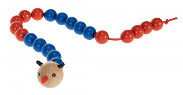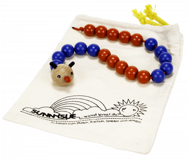 Lieferung 1 Raupe inkl. 20 Holzkugeln und Fädelschnur verpackt in einem hübschen Baumwollsäckchen.