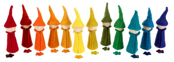 12 Filzzwerge in abgestimmten Regenbogenfarben. Innen stabile Holzfigur. Hut und Mantel fest mit der Hozfigur verbunden. Größe ca. 13-16 cm (Hut). Lieferung ohne Blumen. Material: Massivholz und 100% Schafwolle