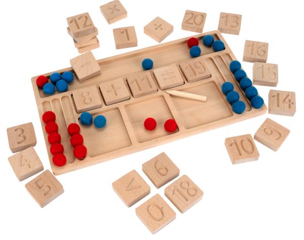28-tlg. Additionsbrett mit Holz-Zahlentafeln und großen Rechenfeldern zum Legen von Kugeln, Steinen oder Naturmaterialien (Lieferung ohne Kugeln). Ideal für 1. Klasse. Erstes Rechnen, Mengen legen und vergleichen. Inhalt: Grundplatte, Zahlentäfelchen 0-20, 6 Rechenzeichen und Nachspurstift. Größe 41 x 22,5 x 1,5 cm, Täfelchen 4,8 x 4,8 x 1,5 cm. Material: Buche