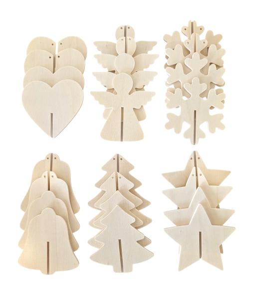 Große Motive. Toller 3D-Effekt. Einfach bemalen und zusammenstecken. 6 Motive. Jedes Motiv 4 x enthalten. Engel, Stern, Tannenbaum, Herz, Schneeflocke, Glocke. Größe ca. 8 cm. Sperrholz 3 mm